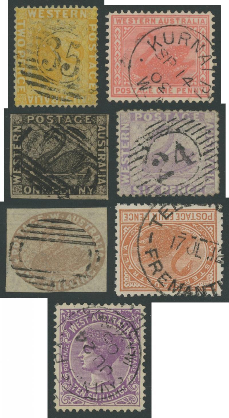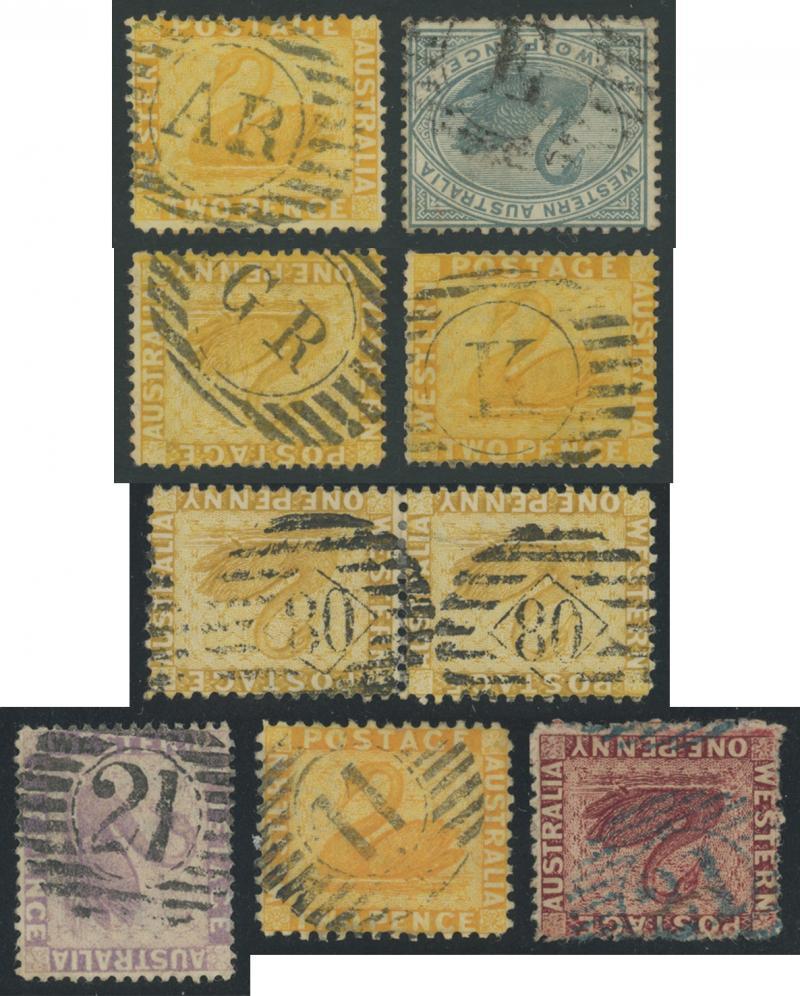 Numeral, Letter & Duplex cancels lightly duplicated collection on leaves with strikes on a good variety of issues from Void Grids, Void Circles & Dumb Obliterator groups; Numbered Grids '10' of Canning(ton), '11' of Fremantle & '15' of Champion Bay (Cheangwa); 15-bars '1' to '24' largely complete including '11' of Newcastle and '22' of Balbarrup; 9-bars '2', '4', '8', '9', '10' & '11' of Arthur River; 12-bars '1' to '36' largely complete including '2' on 1d bistre block of 8, '10' (PO not known), '11' of Berkshire Valley, '18' of Strawberry, '21' of Moojebup/Katanning very fine on 6d violet, '31' of Beverley in blue, '32' of Sharks Bay, and '33' of Jarrahdale in blue; Letters-in-Bars largely complete including 'AR' of Arthur River, 'BE' of Beverley, 'E' of Eticup, 'GR' of Greenough & 'K' of Kojonup, also sub-types and as part of duplex cancels, other Duplexes including Perth '80-80', etc, many fine to very fine strikes.