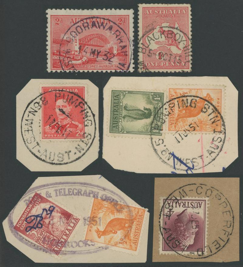Datestamps duplicated accumulation on leaves with many complete strikes on KGV Heads and other Pre-Decimals on-piece with lots of closed Post Offices including Balladonia, Bicton North, Bilbarin, Cave House Yallingup, Corinthian, Dwarda, Helena Valley, Hollows Find, Koolanooka, Kwinana Beach, Lakewood, Lion Mill, Lower Chittering, Marradong, Mount Malcolm, Mount Sir Samuel, Nalkain, Noman's Lake, Ogilvie, Oldbury, Point Samson, Quinn's (three just legible strikes on KGV 1d red x2 & 3d Kangaroo on registered piece), Red Lake, Riverina, Rosa Brook, Shackleton (1914 in violet on 1d Kangaroo), Shannon River Mill, Tullis, Waddi Forest (inscribed 'FORREST' in error), Wanneru, Warralakin, Waterman's Bay, Willow Spring, and many more, also 'POSTMASTER' markings noted '.../GOOMALLING' oval, '.../LEEDERVILLE' boxed, '.../MEEKATHARRA' oval, '.../MT. MAGNET' oval (superb on QEII 6½d orange), '.../NUNGARIN' oval, etc, plus a range of markings on Swans condition variable but many above-average strikes seen.