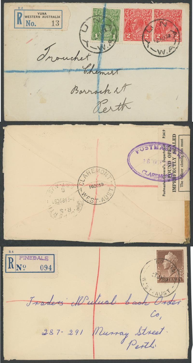Datestamps on pre-decimal registered mail all-different group with lots of closed/renamed Post Offices many with provisional R labels including Alfred Cove, Attadale, Bassendean North, Belmay, Bentley Park x2 (manuscript & cachet), Berwick St West (with 'VICTORIA PARK' added to cachet), Bicton North, Bindoon, Carbunup, Deepwater Point, Donnelly River Mill, Epsomvale (cds tying blank R label), Forrestdale, Fremantle South Beach ("Sth Beach" manuscript), Grantham St Wembley (cds tying blank R label), Greenmount Hill, Grosvenor Road (with 'NORTH PERTH' added to label), Inglewood North ("Ing Nth" manuscript), Koongamia, Mahogany Creek, Maylands East, Mira Mar, Mundaring Weir x2 ("Weir" manuscript and with printed label on KGV 'FIVE/PENCE' on 4½d violet Registration Envelope), No.7 Pumping Station, Redcliffe Park, Riverton North, St Peters Place, Scarborough North, Tuart North, Walcott Street with 'INSUFFICIENT POSTAGE DOCKET/ISSUED AT PERTH' boxed handstamp, Wembley North, West Osborne x2 (manuscript & cachet), plus relief 'ties' Maniana 1959 'No. 16' cds, Nollamara 1958 'RELIEF NO.9' cds & 1959 'No. 26' cds, and Pinedale 1958 Relief 'No. 18' cds all with town name handstamps on blank R labels, also from Claremont 1959 with 'FOUND OPEN/IMPERFECTLY SEALED' label tied by 'POSTMASTER/CLAREMONT' double-ring oval in violet, Bayswater 1931 with Kingsford Smith 2d & 3d and red/white R label, other red labels from Busselton on KGV 4½d violet Registration Envelope, Bridgetown & Bunbury on KGV 5d violet Registration Envelopes, 'YUNA' 1932 on KGV 1d green & 2d red x2 with black & blue/white R label, etc, all on standard-size envelopes, the strikes generally well above-average, condition a little variable but most are fine very fine. A marvellous opportunity.