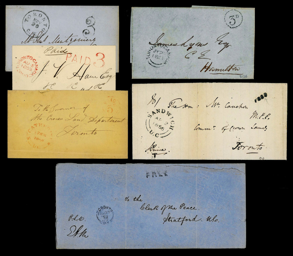 6 CANADA PENCE ISSUE STAMPLESS 1851-1859, includes 2 FREE franks including an 1856 Sandwich-UC SFL to MPP Cauchon at Toronto Crown Lands, signed J. Prince regarding land sale of a deceased property owner, also an 1859 Toronto cover to Stratford-UC signed P.S.O. and E.A.M., 4 items are 3 pence rated including an1855 Toronto SFL to Etobicoke-UC, an 1851 SFL Toronto to Hamilton, an 1853 prepaid cover to Whitby-UC, and an 1858 prepaid cover from St-Catharines-UC to Toronto, each item has a detailed lot description regarding addressees + the senders + mail route, retails over $200 US ($300 CDN), F-VF est (Image)