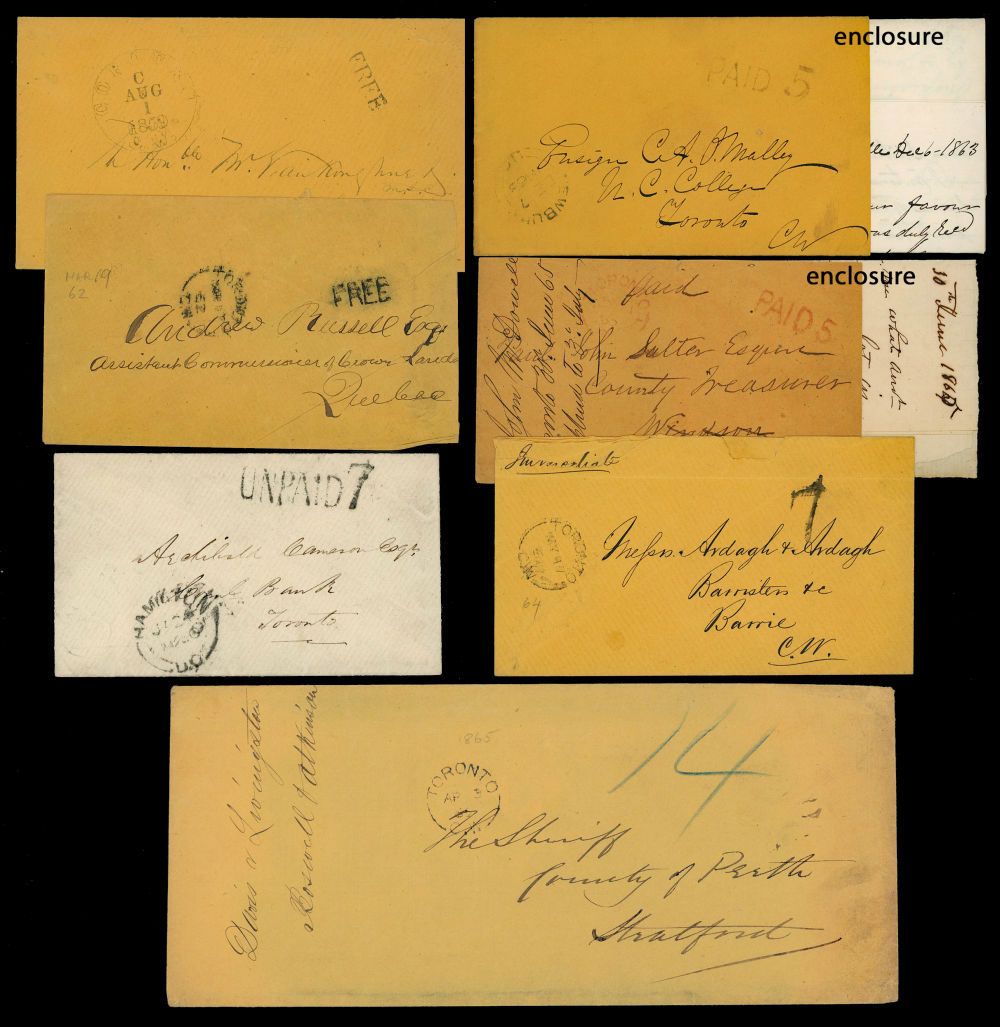 7 CANADA CENTS ISSUE STAMPLESS 1859-1869, includes 2 FREE frank covers to the Crown Lands Department in Toronto 1859 and in Quebec-City 1862 when the Parliament switched locations, 2 are prepaid 5¢ covers and 3 are unpaid 7¢ rates that were charged a 2¢ COLLECT penalty for unpaid letters, also an unpaid double rate cover charged 14¢ with a 4¢ double COLLECT penalty, each item has a detailed lot description regarding addressees + the senders + mail route, retails over $320 US ($460 CDN), F-VF est (Image)