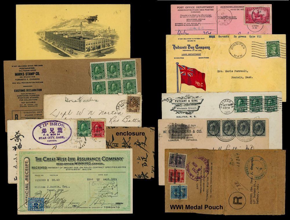 145 CANADA COVERS & CARDS 1874 1937 (some documents), includes 6 Victorian items noting 1874 Alviston-Ont and 1898 Francois-du-Lac-Que cancels, 9 are KEVII covers and cards, 41 are Admiral covers and cards noting a very scarce registered WWI medal packet, 88 are KGV 1923-1937 covers and documents noting better registered, illustrated advertising, and 30 good 1920-1930's receipts & cheques with war tax revenue frankings, 5 covers are legal size, retails over $350 US ($490 CDN), F-VF est (Image)