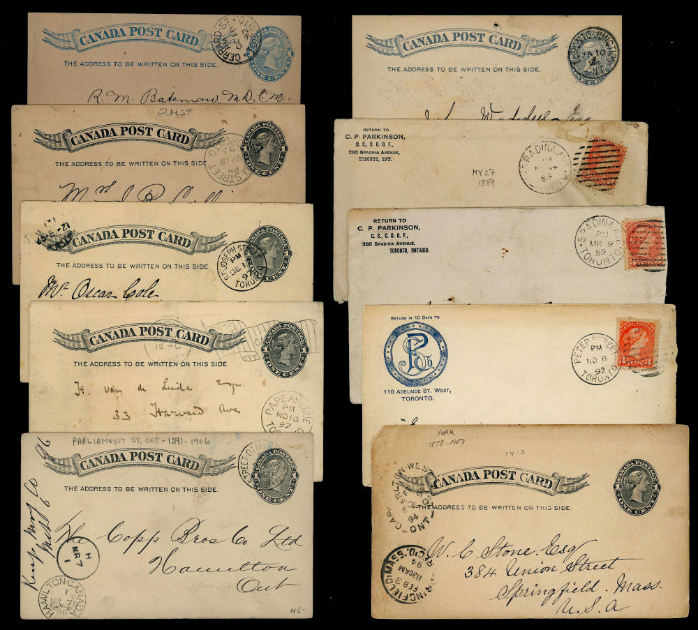 10 CANADA COVERS & CARDS 1889-1897, includes 3 Small Queen franked covers with duplex cancels and posted from Toronto, includes postings at the Peter Street post office and 2 covers posted at the Spadina-Avenue office, 7 have Toronto cds cancels on postal cards mailed from Bleeker-Street, Carlton-West, Elm-Street, Gerrard-Street, Pape-Avenue, Parliament-Street, and St-Joseph-Street, each item has a detailed lot description, retails over $200 US ($300 CDN), F-VF est (Image)