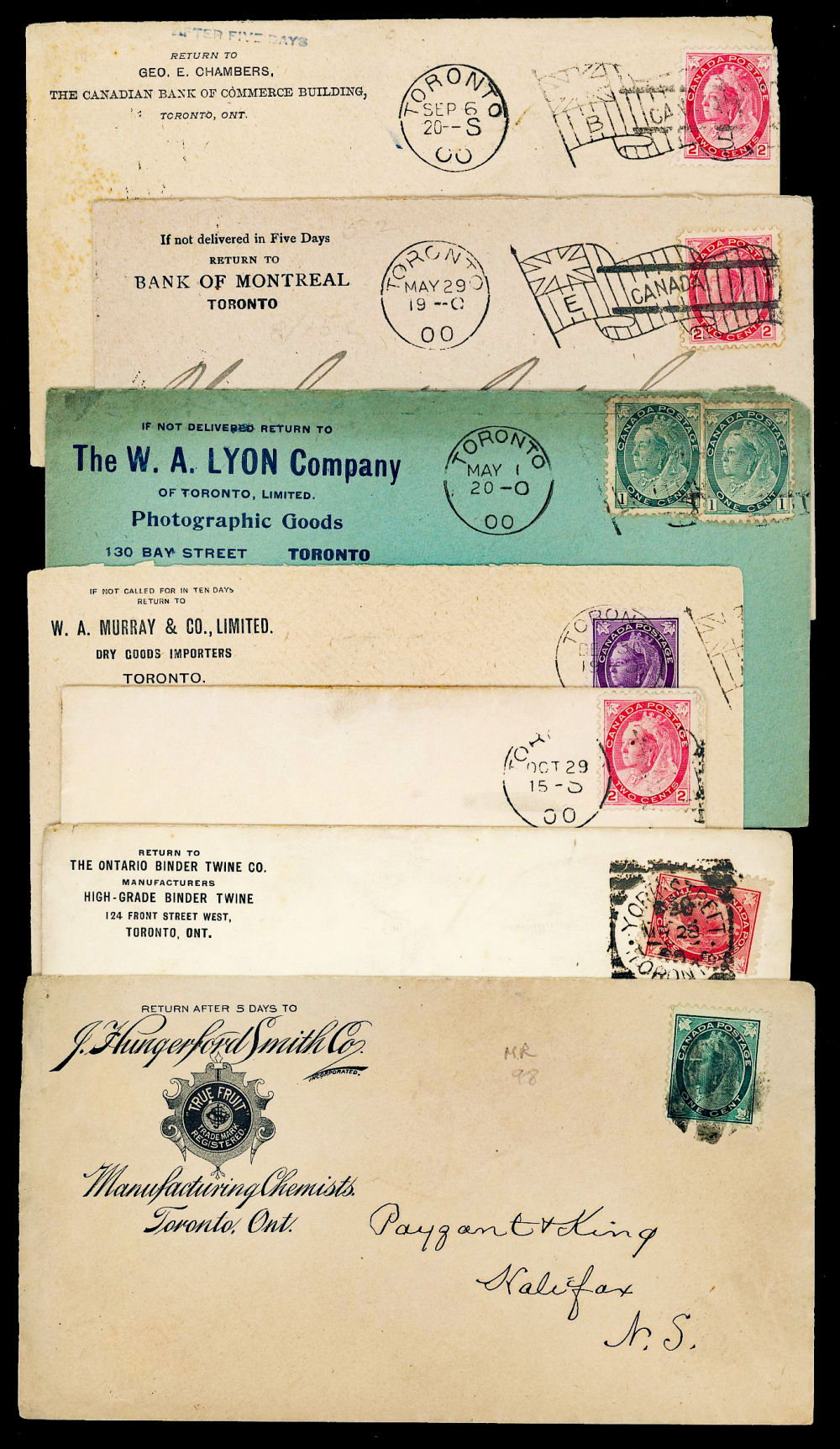7 CANADA LEAF-NUMERAL COVERS 1898-1903, all postal at Toronto, includes a Hungerford Chemical advertising cover, an unsealed printed matter 1¢ rate to Halifax with a cork cancel, 5 covers with Toronto Flag cancels, a cover with a York-Street squared circle cancel, each item has a detailed lot description, retails over $100 US ($150 CDN), F-VF est (Image)
