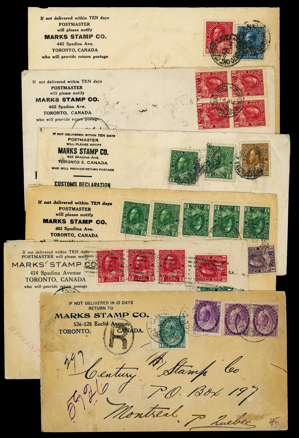 10 CANADA "MARKS" STAMP DEALER COVERS 1902-1931, all are registered from Toronto and addressed to both Canada and USA customers, includes rates of 7¢, 8¢, 12¢, 13¢, 14¢, and 15¢, a nice group from the dominant Canada dealer for the period, retails over $150 US ($220 CDN), F-VF est (Image)