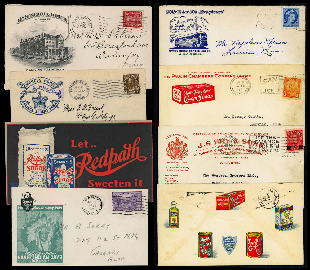 23 CANADA ADVERTISING COVERS 1921-1955, includes better 1936 Empress Hotel at Prince Albert (SASK), c-1921 unposted multi-color Redpath Sugar overall advertising at Chantery (ONT), 1923 Simpson's Department Stores, 1931 Paulin's Soda Crackers at Winnipeg, 1932 Fry's Cocoa at Winnipeg, 1949 CPR Banff Indian Days, 1936 Assiniboia Hotel at Medicine-Hat, 1945 Campbell Grocers multi-color overall illustrated at Winnipeg, 1955 Grayhound Buses ++, retails over $300 CDN, F-VF est (Image)