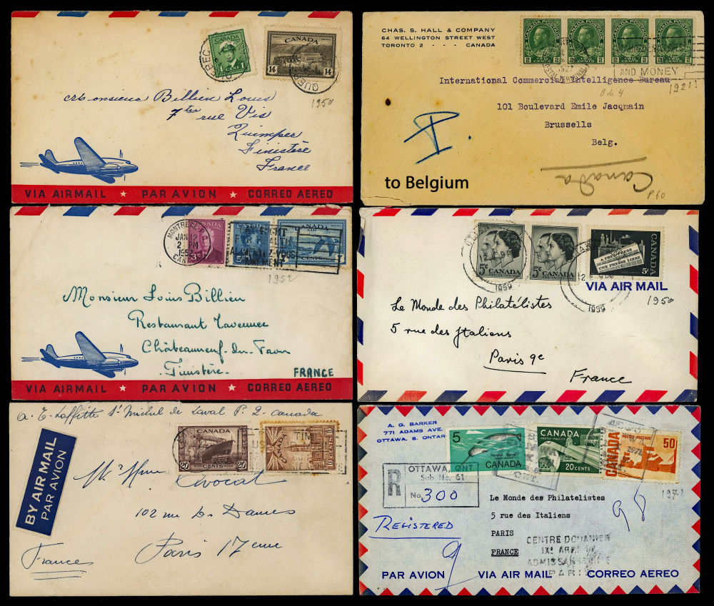 20 CANADA RATES to FRANCE 1942-1970's (one earlier Belgium rate), 17 are airmail 15¢ rates, plus a 1945 uncensored airmail 30¢ rate and a 1971 registered airmail 75¢ rate, there is one 1948 UPU 4¢ rate, the lot has a 1927 UPU rate to Belgium and a not counted domestic 7¢ airmail cover, retails over $275 US ($390 CDN), F-VF est (Image)