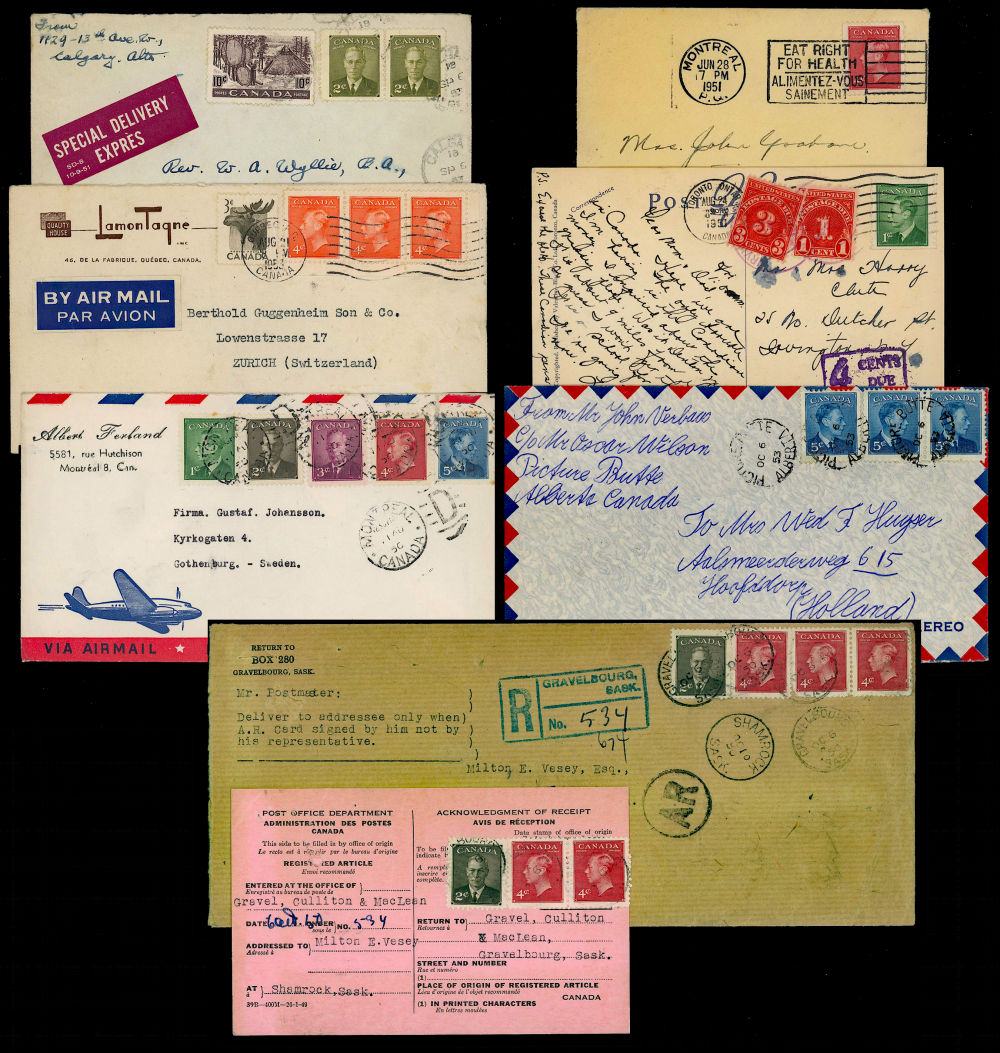 16 CANADA KGVI COVERS 1949-1953, includes better airmail rates to Sweden, Switzerland, and Netherlands, also UPU to Mexico, a precancel 2¢ printed matter domestic rate, short paid to USA with postage dues, special delivery, returned registered cover with original AR card attached, slogan cancels ++, retails over $280 US ($400 CDN), F-VF est (Image)