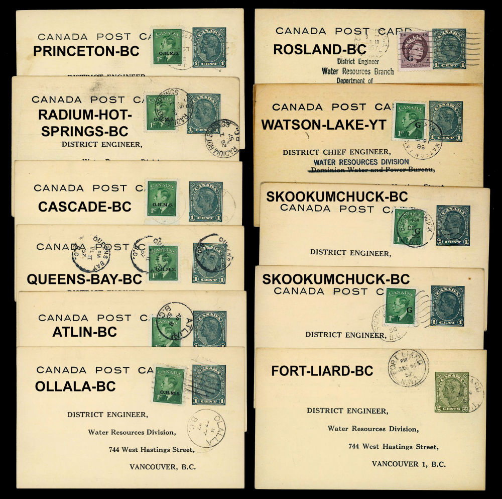 12 DOMINION WATER LEVEL CARDS 1956-1957, 4 different Government postal card forms to monitor creek and river levels in BC, Yukon, and NWT for flood control, note 11 cards are up-rated with Official stamps #O16 and #O40, note BC postings at Atlin, Skookemchuck, Rossland, Cascade, Radium-Hot-Springs, Queen's-Bay, Clalla, and Princeton, also a NWT posting at the Hudson's Bay store in Fort-Liard, and a Yukon posting at Watson-Lake, the various creek + river + lake names with dated water are identified, retails over $100 US ($150 CDN), F-VF est (Image)