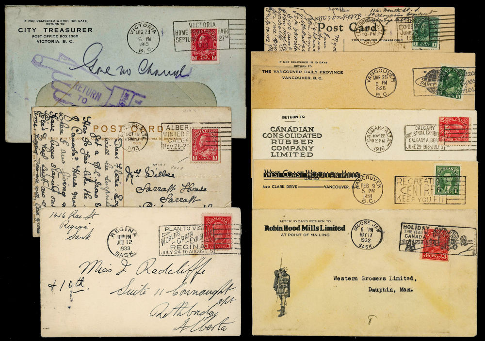 72 CANADA SLOGANS 1913-1940's (a few later), on covers and cards mostly from Western Canada, includes 30 Admiral period slogans 1913-1920's, 20 are KGV period 1927-1937, 17 are KGVI 1937-1952, and 5 are QEII slogans, note scarce WWII Blackout slogans, some better advertising slogan covers, pictorial slogans, early fairs and exhibitions, rates to England, 6 are duplicate Calgary Industrial Exhibition slogans, retails over $500 CDN, F-VF est (Image)