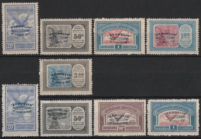 1930 Zeppelin blue opt set 20c-3.60P plus green opt 20c-1P. VF fresh MLH. Scott C30-37 cat US$165. SG 582-91 cat £426. (9) (P) (Image1)