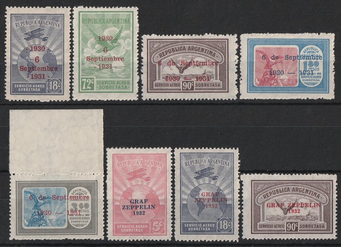 1931 First Anniv opt Airmail set 18c-3.60P, plus 1932 Zeppelin opt set 5c-90c. VF fresh MLH. Scott C20-28 cat US$390. SG 624-31 cat £335. (8) (P) (Image1)