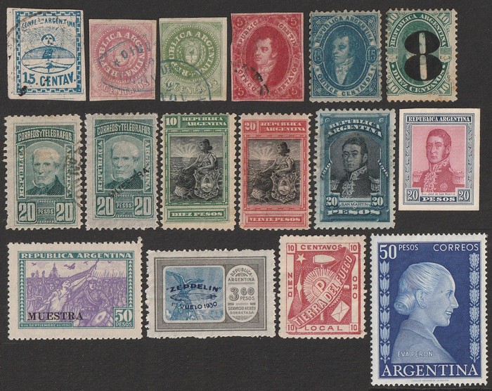 Argentina: 1858-2000 Collection in s/book & binder. 1858 Confederation set 5c-15c, plus 5c & 10c blks of 4. 1862 Arms to 15c inc types & noted reprints. 1864-67 Rivadavia set to 15c, perf, plus 5c imperf. 1873 Portrait set to 90c M. 1873 Surch 1 on 5c - 8 on 10c. 1887 Portrait set to 50c. 1890 High val set 1p-20p, plus set opt MUESTRA (Specimen). 1899 Liberty set to 20p. 1910 Centenary set to 20p. 1912 Ploughman no value imperf proof. 1916 San martin 5p-20p opt MUESTRA. 1917 San Martin set to 20p imperf proofs. 1923 Belgrano 3c blk of 4, error imperf between stamps & right margin. 1930 Revolution to 20p, plus set to 50p opt MUESTRA. 1920 Airmails to 3.60p. 1930 Zeppelin opt to 3.60p inc blue & green opts. 1932 Zeppelin opt set. 1935-51 Pic Def to 20p. 1944 Anthem M/S imperf, both shades. 1952 Eva Peron set to 50p. Useful later commems inc M/S. Also 1891 Tierra Def Fuego 10c Local Post. Mostly G-VF M/MNH/U. SG cat £6700+ = A$13,000+. (2250, +85M/S). A valuable collection. (P) (Image1)