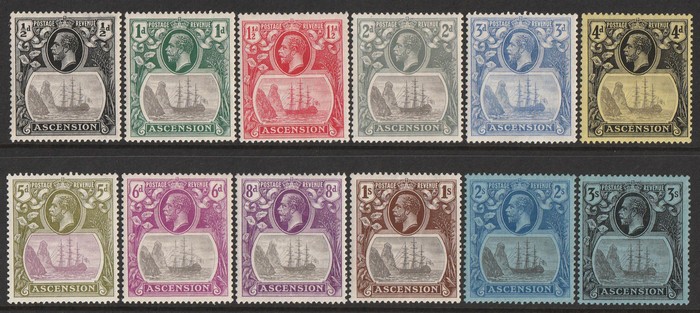Ascension: 1922-80s Mint collection in binder inc 1922 opt KGV St Helena set to 3/- (SG cat £325). 1924-33 KGV Ship set to 3/- (£350). 1934 KGV Pic set to 5/- (£130). 1935 Silver Jubilee set. 1938-53 KGVI Pic set to 10/-. 1948 Silver Wedding set. 1956 QEII Pic set to 10/-. 1963 QEII Bird set to £1. 1981-82 Flower set to £1. 1986 Ship set to £2. G-VF M/MNH, post 1960 MNH, some gum tropicalisation. SG cat £2300+ = A$4600+. (475 + 19 M/S) (P) (Image1)