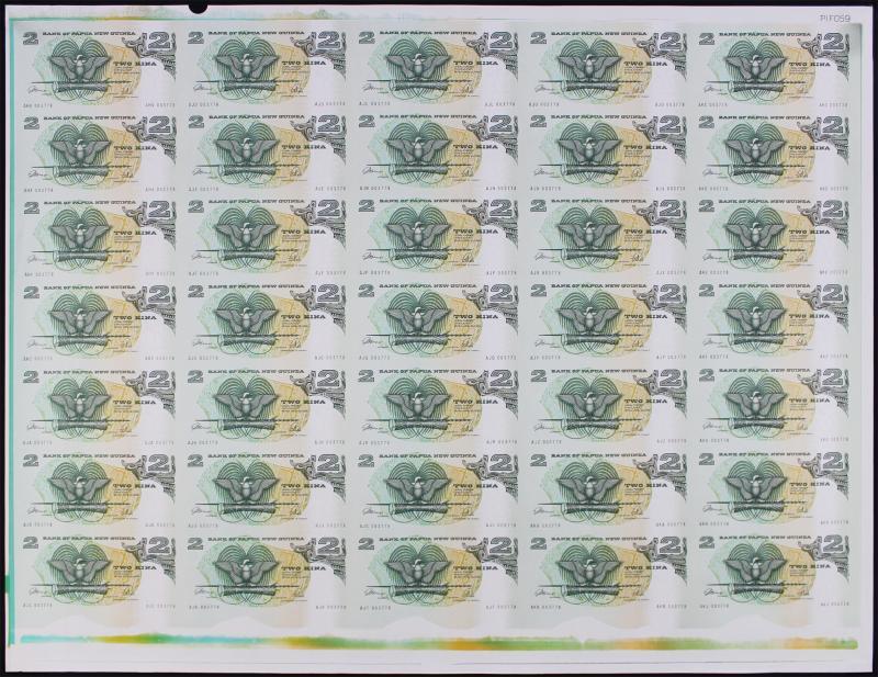 Pacific Islands uncut banknote sheets group comprising Papua New Guinea 1990 2 kina sheet of 35 x2; Samoa 1990 2 tala polymer sheet of 35; and Fiji 2000 $2 'Y2K' block of 20; all Uncirculated.
