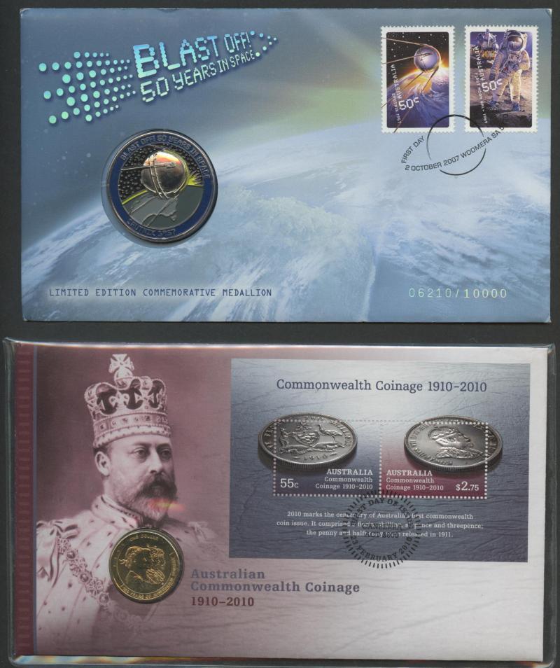 Two cartons containing Australia copper and some silver in cigarette tin, noted 1d Dot Below Lower Scroll heavy rim knock otherwise Unc, 1989 silver (1¼oz) Dollar & Dump; Franklin Mint product including Proof sets with Bahamas 1974, & British Virgin Islands 1974 x2, PNG 1977 10k PNC, and a couple of medallic covers; World circulated banknotes (22); also Stamps mostly from Australia with 1981 yearbook, stamp packs, blocks and 27c sheet, FDCs & PSEs; etc, condition variable. Weighs 9kg.