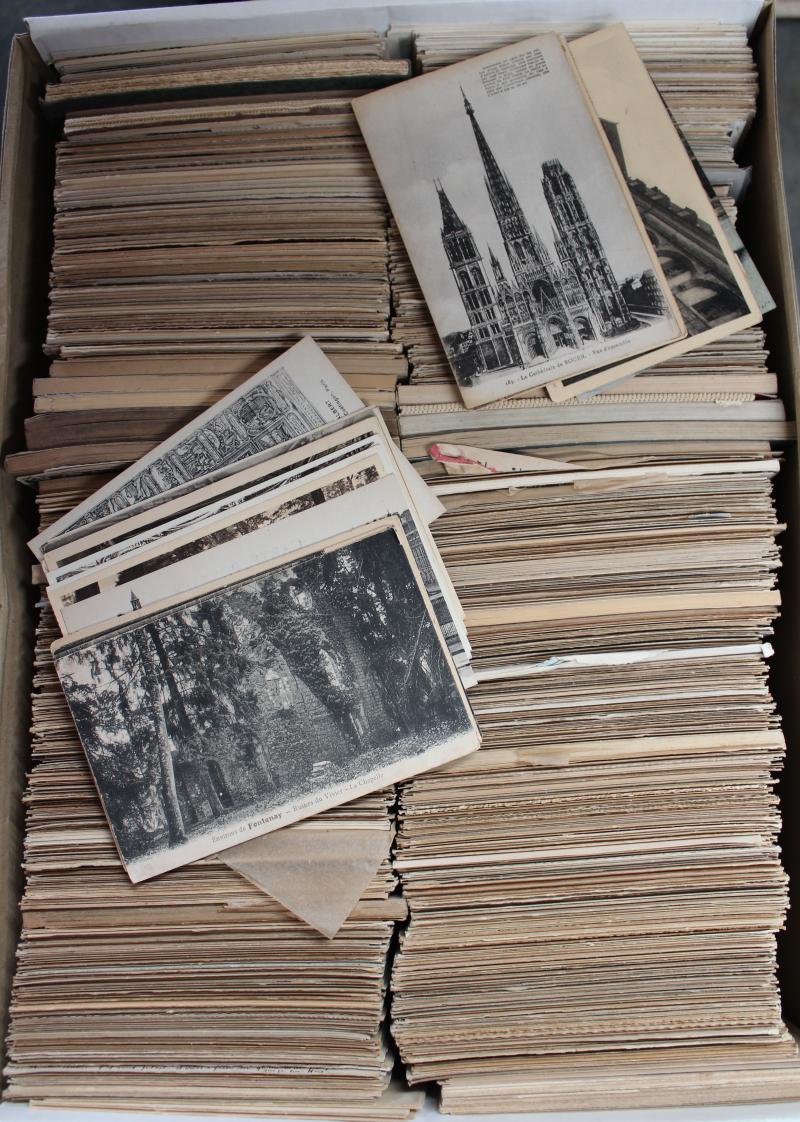 European cards accumulation in two large boxes featuring chateaux, churches & cathedrals, scenery, statues, etc, most are French from the early to mid-1900s in either sepia or black and white, condition generally fine to very fine. Weighs 20kg.