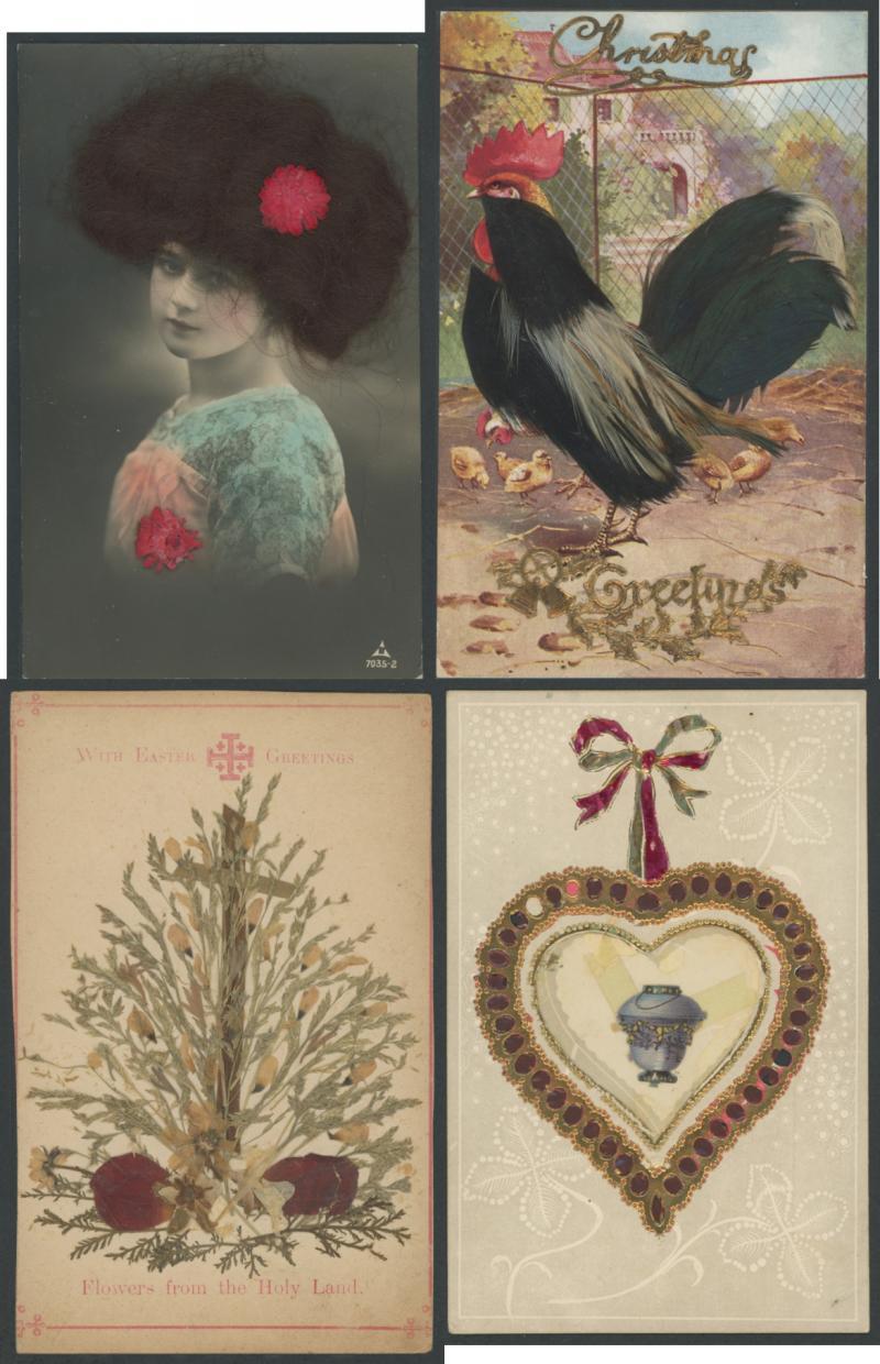 NOVELTY POSTCARDS: An extraordinary partly-mounted/annotated collection with many remarkable 'mechanical' cards with moving parts including tabs, wheels & cords, others with a wide array of appliqués including feathers, fabric, (human?) hair and a variety of early plastics, another group fashioned from metal, leather or wood, further three-dimensional novelties some up to 1cm thick, fold-out, panoramic & oversize cards, etc, generally fine to very fine but some damage as must be expected with such non-conforming items, most of which surely weren't really intended to pass through the mail...or were they? A very challenging collection to assemble and an opportunity to own something really different. Weighs 10kg.