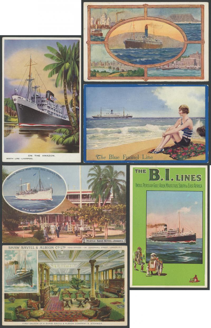 SHIPPING - GREAT BRITAIN: Balance of mostly pre-1960s shipping lines collection in ten homemade albums or loose including Aberdeen Line x45, Blue Funnel x42, Booth x15, British India x45, Elder-Dempster x28, Furness (Bermuda) x27, RMSP x69, Shaw Savill x35, Union Castle x89, etc, mostly ship 'portraits' with many beautiful designs & advertising, condition variable but mostly fine to very fine. Weighs 7kg.