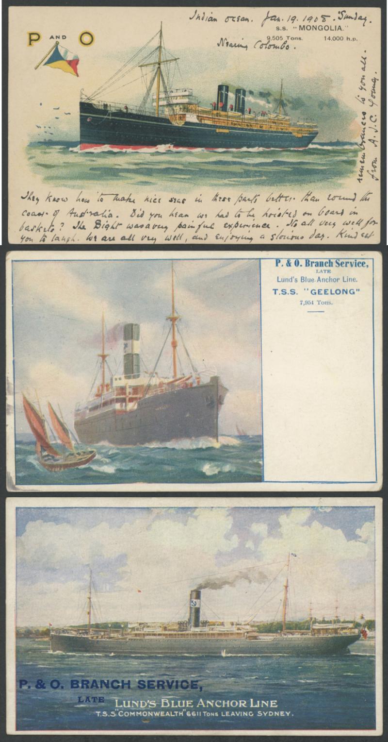 SHIPPING - GREAT BRITAIN: Peninsular & Oriental Steam Navigation Co collection of mostly artist ship "portraits" with many beautiful designs, Undivided Backs & several Blue Anchor Line types, also 1907 leather-bound 'P&O/Post Card Souvenir No 1' booklet intact with 24 cards (very fine), plus many French editions, earlier cards variable then mostly fine to very fine.