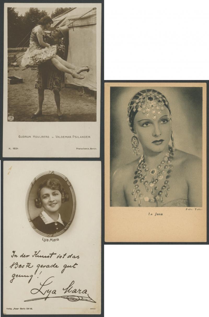 THEATRE: Bulging album of German & other European cards featuring stars of stage & early screen who would have been household names in Bratislava, Warsaw, Munich, Malmo and Zagreb etc, includes sections of Asta Nielsen, Vilma Banky and Lya Mara, many others with such melifluous names as Frits van Dongen, Margarete Slezak, Volker von Collande, Hilda Garden, Irene Gawecka, Jwan Petrovich, Albrecht Schoenhals, Lillebel Christensen, Heli Finkenzeller, Iwa Wonja, Olga Tschechowa, etc, mostly unused. A high proportion come with brief biographical career notes. Weighs 5kg.