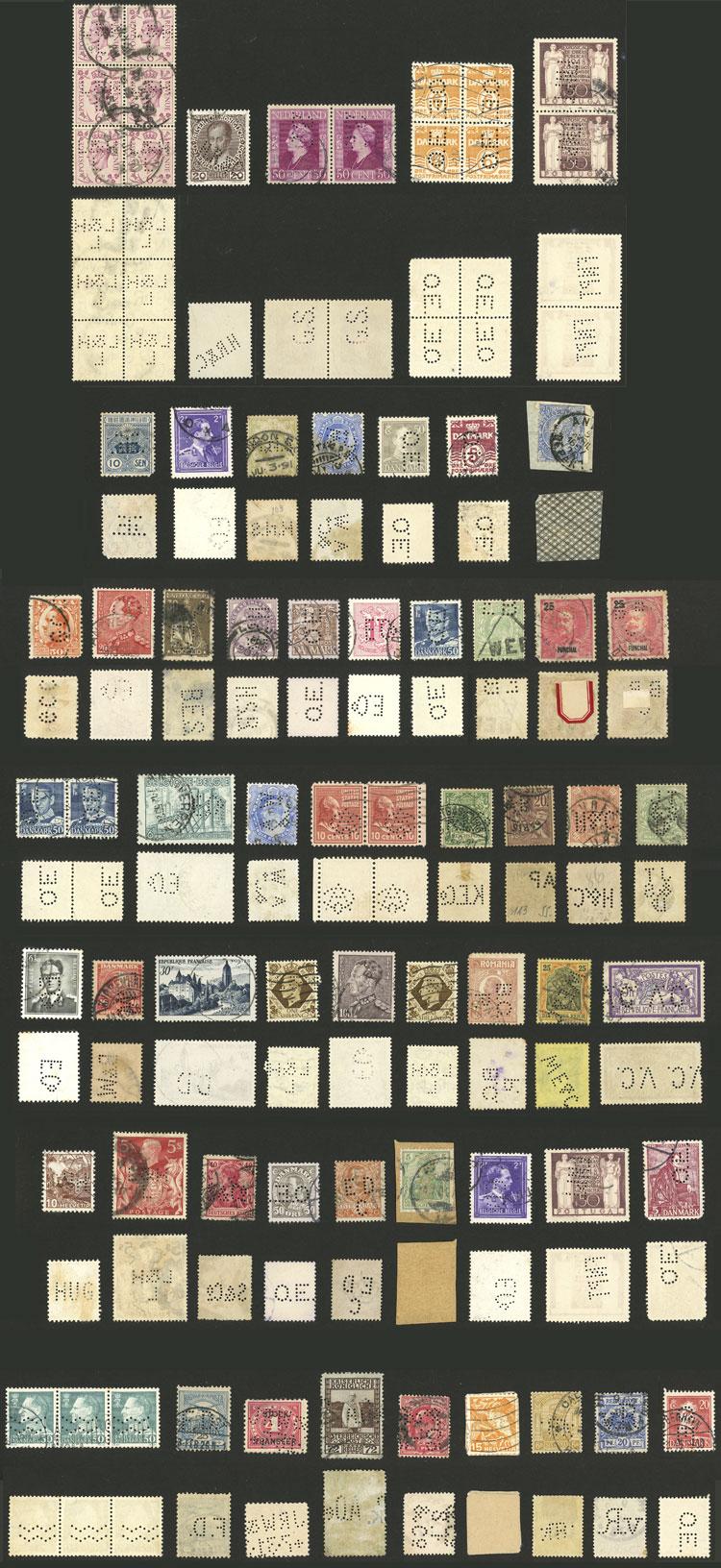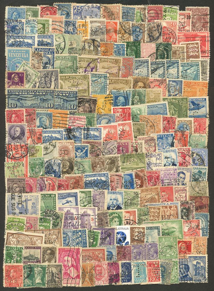 PERFINS: Over 370 stamps with commercial perfins, including several countries and interesting material, fine to very fine general quality, low start! IMPORTANT: Please view ALL the photos of the lot, because all the material has been scanned, at least partially. (Image)