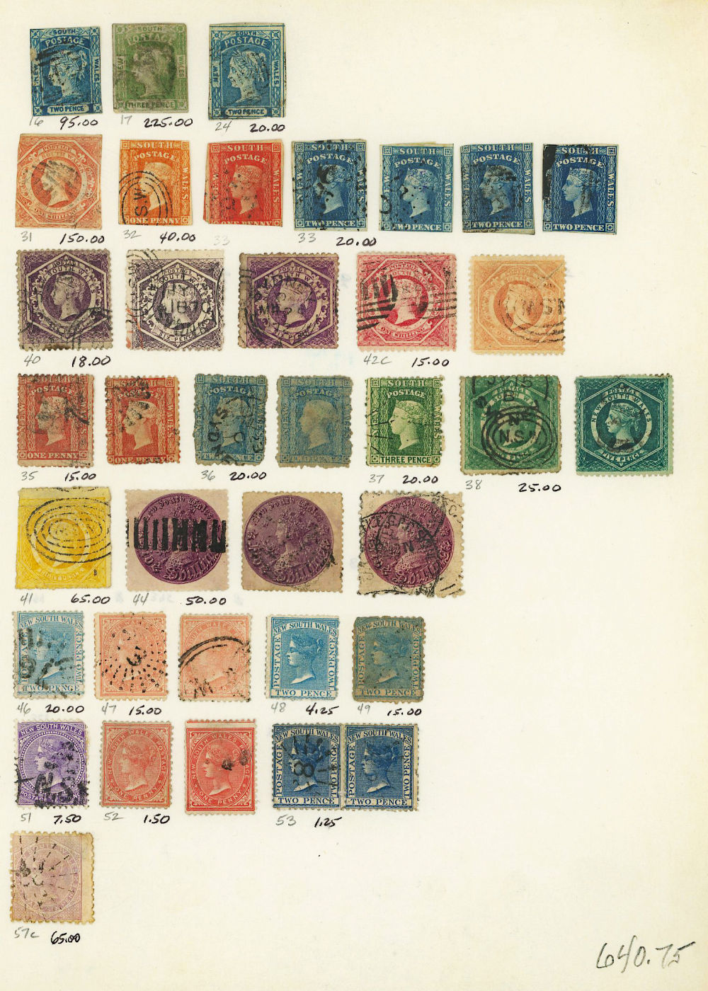(#16/128) NEW SOUTH WALES USED STOCK 1852-1912, 273 stamps mounted by Scott on album pages with 1-6 of each stamp, includes BOB postage dues, officials #O2/O38, and some fiscal issues, Scott cat over $1160 US ($2450 CDN), VG-VF est ($75+ US) (Image)