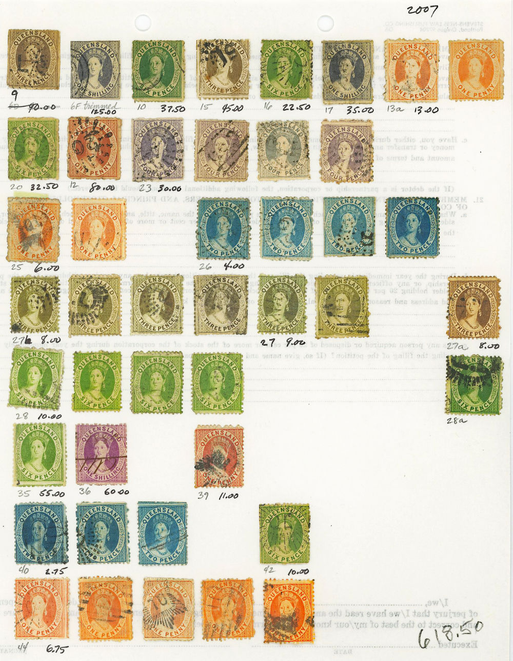 (#9/136) QUEENSLAND USED STOCK 1860-1912, 305 used stamps sorted by Scott and mounted on 8 album pages with 1-5 of each stamp, a nice range of ink shades, unchecked for papers, perfs, print varieties, and town cancels, Scott cat over $2460 US ($3500 CDN), VG-VF est ($150+ US) (Image)