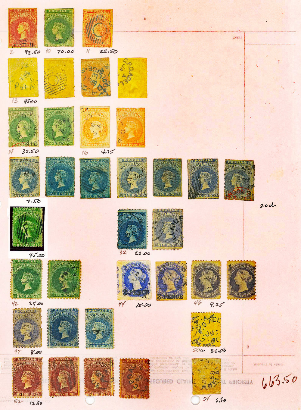(#2/155) SOUTH-AUSTRALIA USE STOCK 1855-1912, 164 stamps (85 different) mounted on 6 album pages with 1-8 of each stamp, a nice range of ink shades, unchecked for papers, perfs, watermarks, town cancels, print varieties, also 49 BOB officials #O35/O82, Scott cat over $1005 US ($1450 CDN), VG-VF est ($75+ US) (Image)