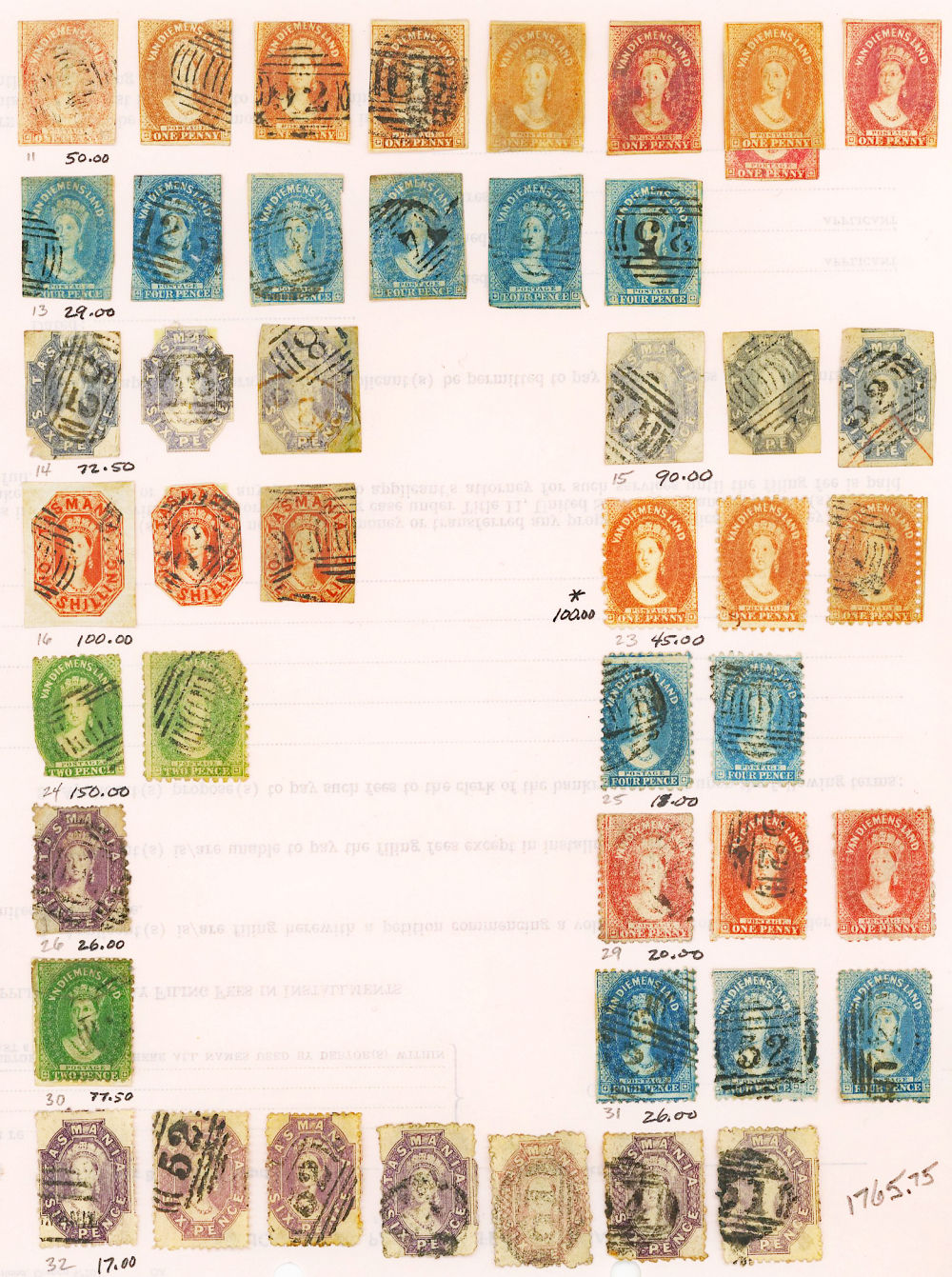 (#11/117) TASMANIA USED STOCK 1857-1912, 245 stamps (59 different) mounted on 5 album pages with 1-8 of each stamp, a nice range of ink shades, unchecked for papers, perfs, watermarks, town cancels, print varieties, a few BOB fiscal issues, Scott cat over $2300 US ($3300 CDN), VG-VF est ($150+ US) (Image)