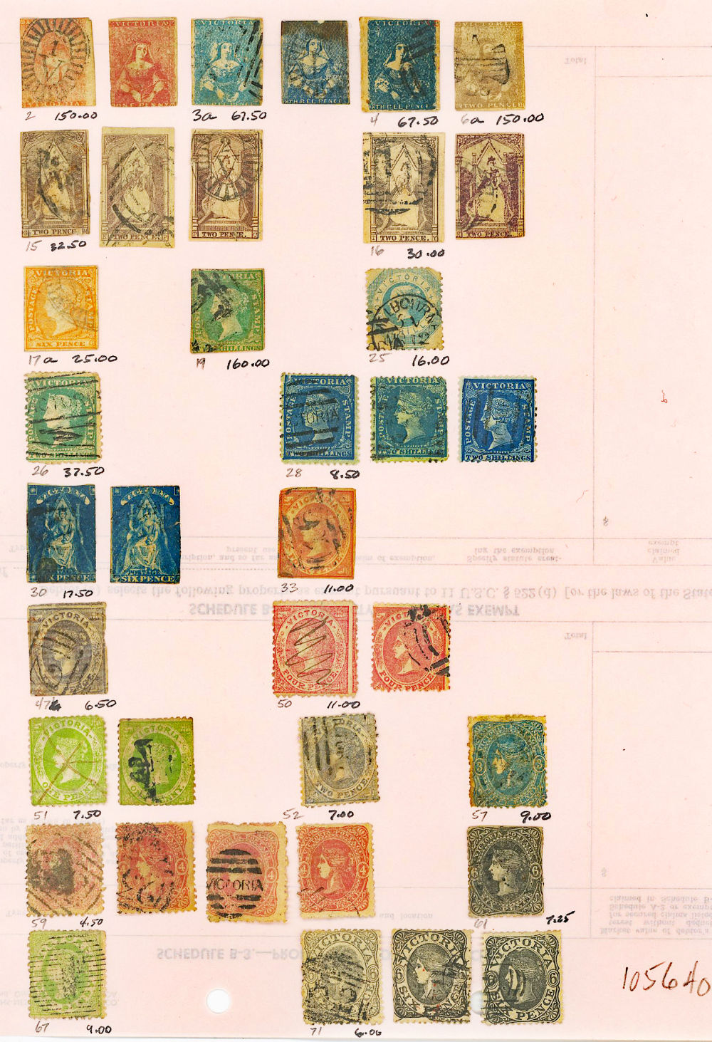 (#2/232) VICTORIA USED STOCK 1850-1912, 212 stamps (102 different) mounted on 5 album pages with 1-8 of each stamp, a nice range of ink shades, unchecked for papers, perfs, watermarks, town cancels, print varieties, a few BOB fiscal issues, Scott cat over $1530 US ($2200 CDN), VG-VF est ($100+ US) (Image)
