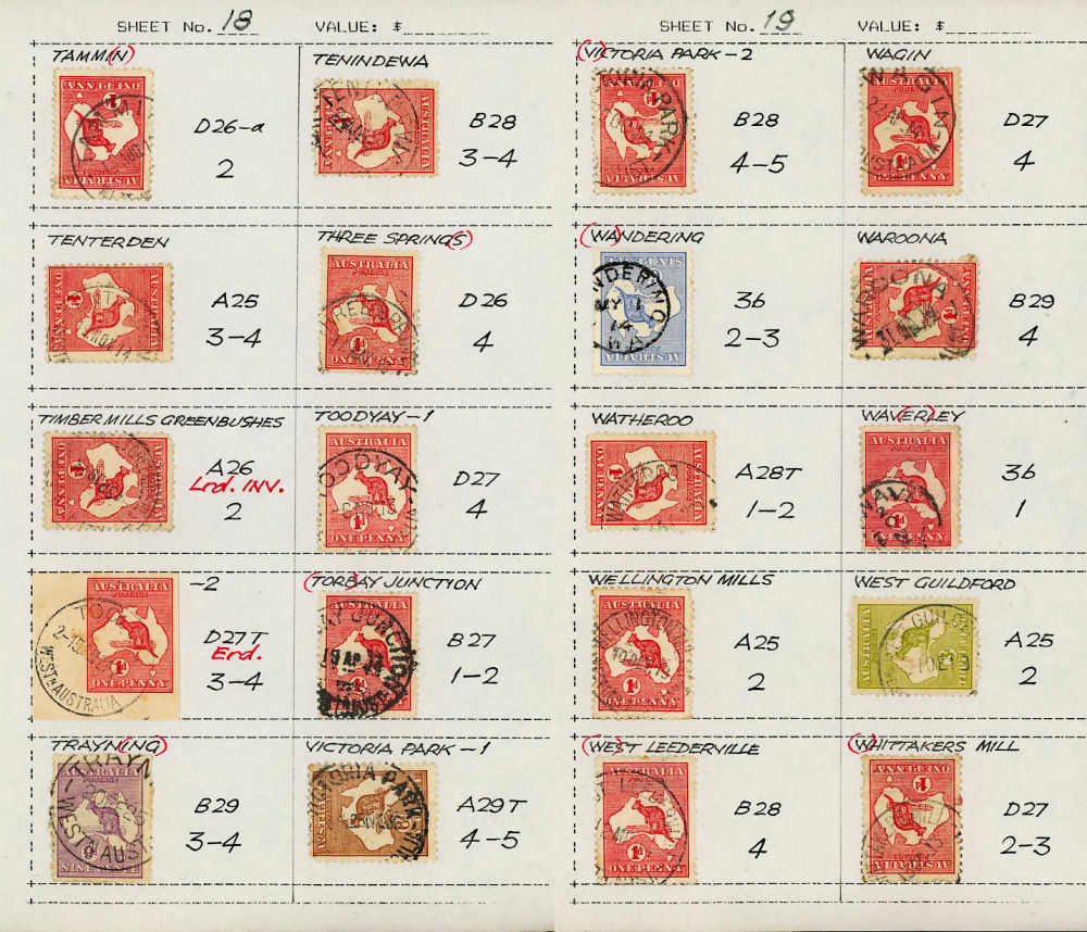 WEST AUSTRALIA TOWN CANCELS 1913-1930's, all different towns on 238 ROOS stamps in a small album and rated by the 2002 Postmark catalog, note better Barrabu (D27), Beenup (D26), Claremont (A25), East-Kirup (B29), Golden-Bridge (B27), Gwalia (D27), Israelite-Bay D26), Kronkupp (b28), Nangeenan (A26), Newcarrie (B28), New-Norcia (B28), Osborne-Park (D27), Protheroe (A25), Roslyn-Farm (D27), Smiths-Mill (A28) ++, also color cancels, some TPO's and miscellaneous cancels, retails over $540 US ($650 CDN), F-VF est ($75+ US) (Image)