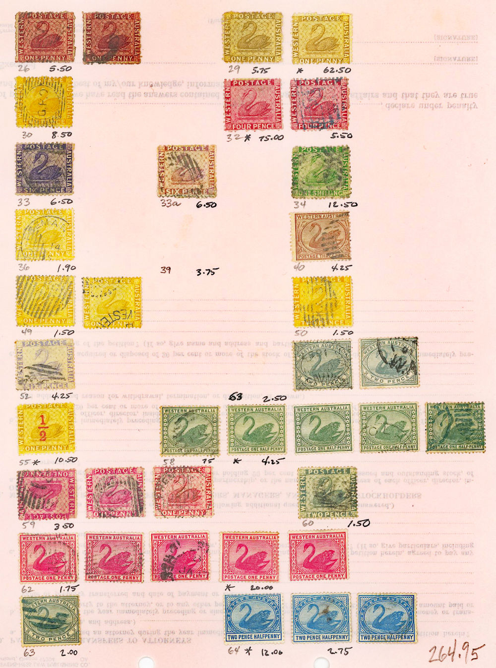 (#14/96) WEST-AUSTRALIA USE STOCK 1860-1912, 80 stamps (38 different) mounted on 3 album pages with 1-8 of each stamp, a nice range of ink shades, unchecked for papers, perfs, watermarks, town cancels, print varieties, a few BOB fiscal issues, Scott cat over $590 US ($850 CDN), VG-VF est ($50+ US) (Image)