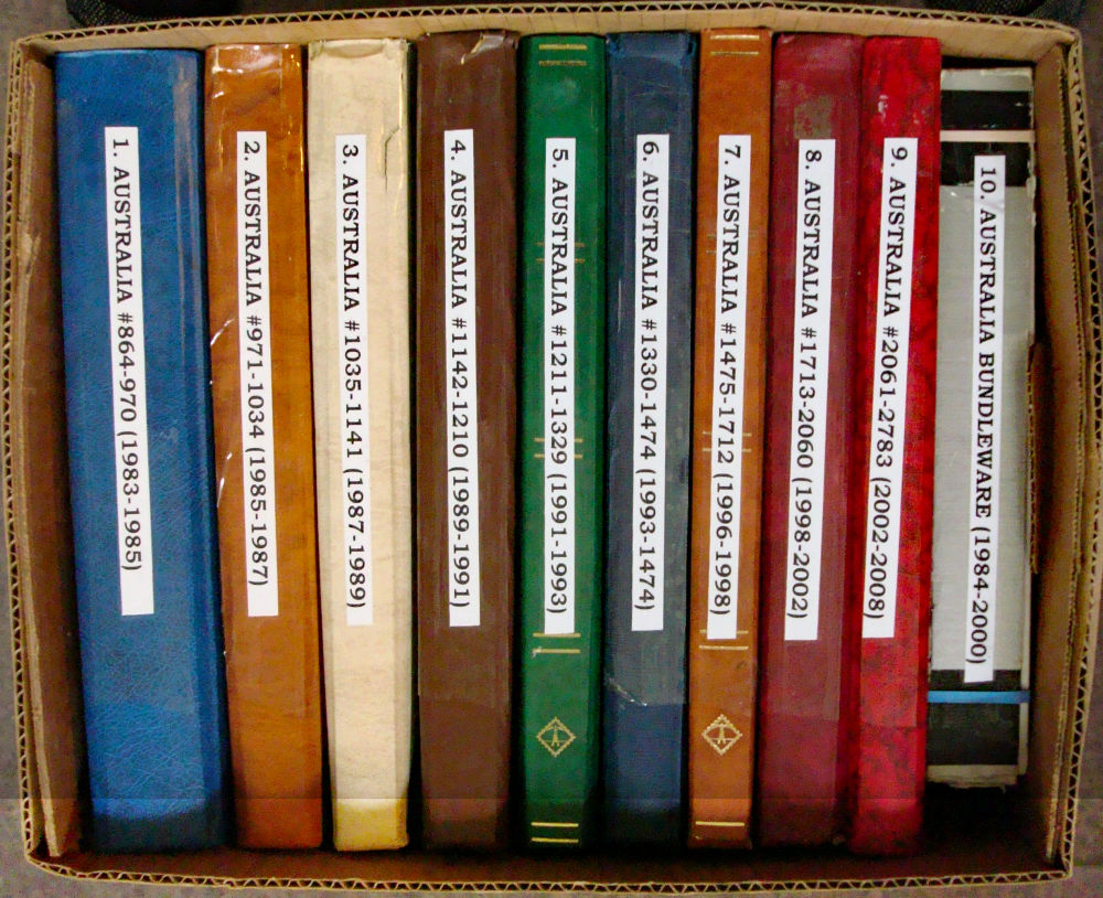 (#864/2856) AUSTRALIA USED COMMEMORATIVE STOCK 1983-2008, 49,000 stamps in 9 stockbooks and a box of 1984-2000 bundleware with 1-20 of each stamp, (some with more up to 300 stamps), note 1000's of stamps with SON town cancels, completely unchecked for papers, perfs, printing varieties ++, Scott cat over $16,000 US ($23,000 CDN), mostly VF est ($200+ US) (Image)