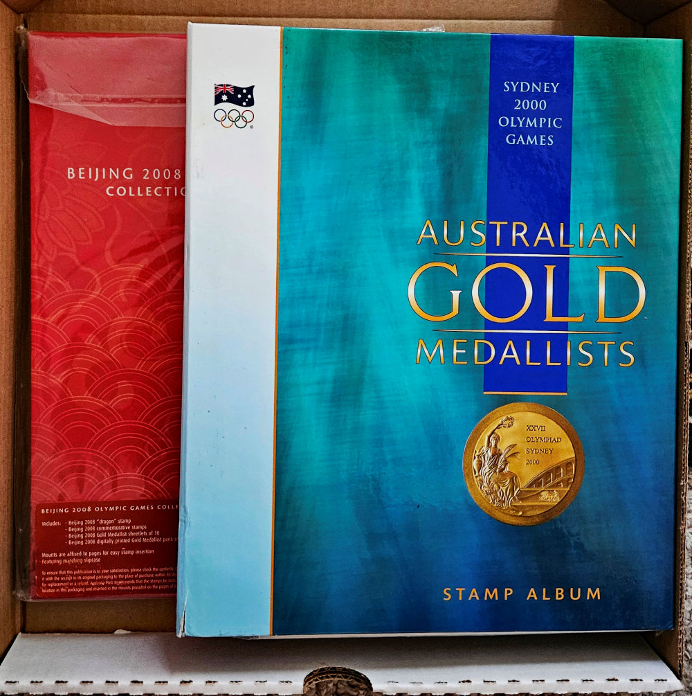 (#1873/3199) AUSTRALIA MNH COLLECTIONS 2000-2009, 387 stamps in 3 albums including the Sydney 2000 Olympics collection with 16 souvenir sheets showing each of the gold medal winners (160 stamps), also the Beijing 2008 Olympic collection with the 14 gold medalist souvenir sheets + stamp pairs + Beijing Dragon stamp + the 3 Olympics commemorative stamps (172 stamps), and an Australia 2009 year set album (55 stamps), Scott cat over $500 US ($700 CDN) with Australia $249 face value, VF est ($100+ US) (Image)