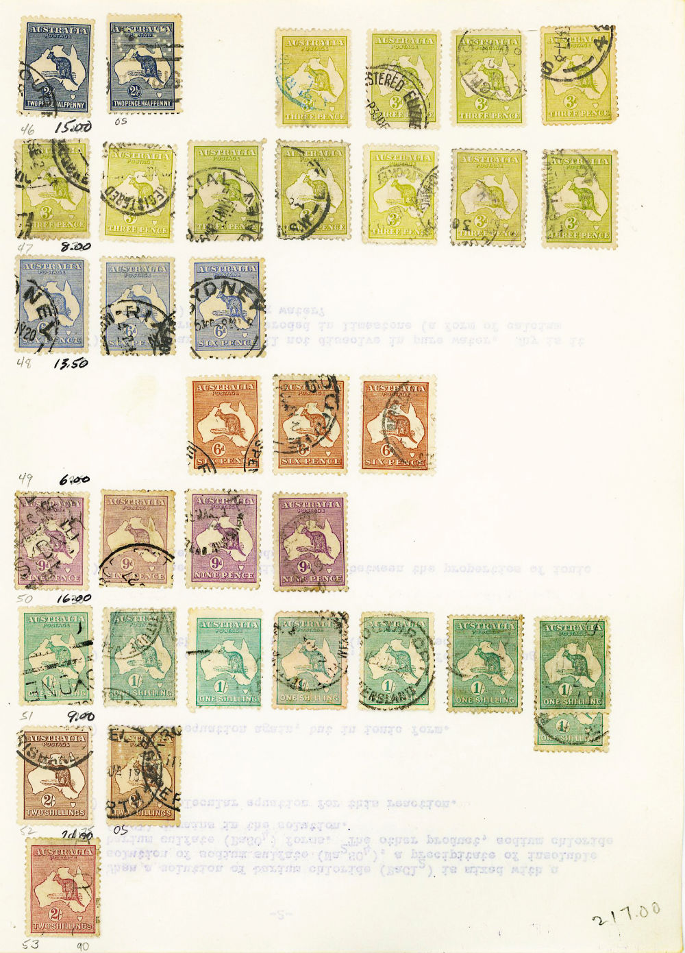 (#1/165) AUSTRALIA USED STOCK 1913-1937, 2750 stamps on 17 packed stock sheets with 1-20 of each stamp (a few with more up to 60 stamps), includes better ROOS #4 (x11), 6 (x9), 7 (x6), 8 (x18), 9, (x5), 10, (25), 11 (x3), 12 (x2), 37 (x4), 39 (x7), 52 (x9), 53 (x7), 97 (x24), 98 (x36), 99 (x22), 100 (x1), 121 (&), 126 (x3), all unchecked for varieties and missing only the high value 10sh and £2 values, Scott cat for ROOS alone at over $5700 US, also note quantities of 3 to 19 stamps for #18, 105, 107, 144, 149, 151, 154, 161, 165 ++, a fabulous lot with lots of nice SON cancels, total Scott cat is over $9800 US ($14,000 CDN), F-VF est ($350+ US)