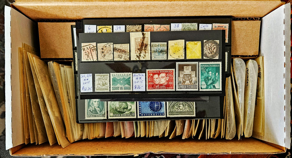 (#1/611) AUSTRIA USED STOCK 1850-1956, 10,925 stamps sorted by Scott on stock sheets, also #14/556 in 60 glassines noting 5-100 of each stamp with great SON town cancel value, note good used #1, 6, 19 (x3), 20 (x3), 39, 174 ++, and better mint #315, 330, 537, 558-559, 580, 583, 587, 589, 594, 608, 610-611, B272, B279, B294, J11, J13, M42 ++, includes a few Offices in Turkey and Crete, Scott cat over $5800 US ($8000 CDN), F-VF est ($200+ US) (Image)