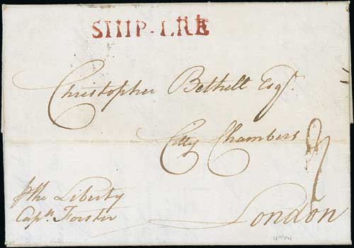 The Liberty/Antigua. 1793 (Oct 11) Entire letter from Antigua to London "p. the Liberty Capn Forster" with scarce red "SHIP-LRE" (S34, applied in London to mails landed at out ports without their own handstamps), and Dec 17 backstamp, with a copy of a notice of the wreck of "The Liberty" taken from Lloyds List of 17 December 1793 - "The Liberty, Forster, from Antigua to London, went ashore on the Middle Ground, near Ramsgate, but is got off with the assistance of boats with considerable damage", and a copy of the 1793 Survey of the Varne & Ridge which shows the wreck site of the Liberty. This letter was landed at Ramsgate and taken in a sealed bag to London; the ship was pulled off the Goodwin Sands and stripped down for salvage. A unique early and well documented wreck cover, not recorded by Gwynn & Hoggarth who only record one earlier wreck cover. Photo on Page 52. (Image1)