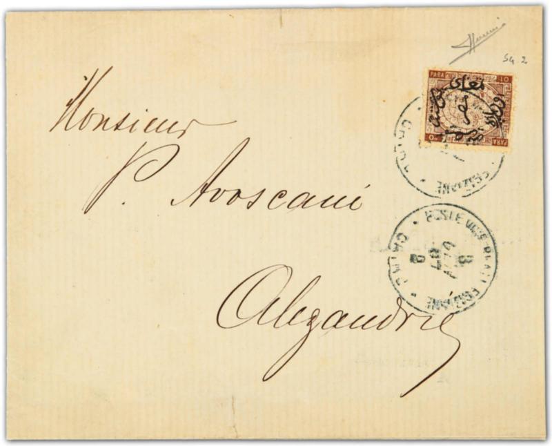 1867, printed matter rate entire letter sent from Cairo to Alexandria bearing single franking first issue 10 para tied by "Cairo 3 Jan.67" postmark, on reverse Alexandria arrival cds (Image)