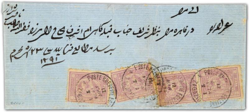 1874, entire letter from Zagazig to Cairo bearing four 10 para stamps tied by "Poste Khedivie Egiziane Zagazig 12.Mar,1874" postmarks, on reverse Cairo arrival cds (Image)