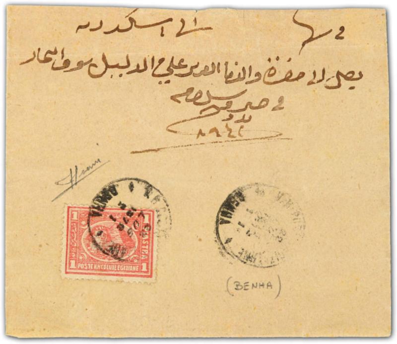 1872, entire letter bearing single franking 1 piastre tied by "Benha" postmark sent to Alexandria, on reverse arrival cds (Image)
