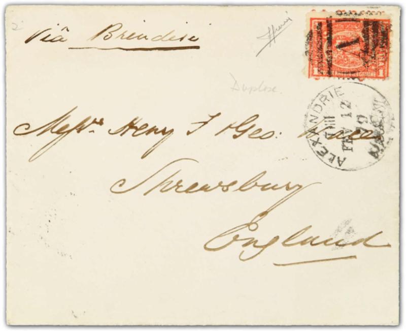 1879, cover sent from Alexandria to England bearing single franking 1 piastre tied by "A" and "Alexandria" postmarks, on reverse "Shrewbury 22.Feb.79" arrival postmark (Image)