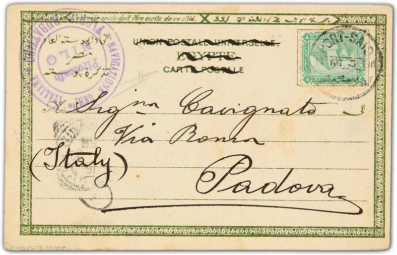 1903, picture postcard bearing single franking 2 mil. tied by "PORT-SAID" cds, alongside showing large double-circle "NAVIGAZIONE GEN.LE ITALIANA FLORIO RUBATTINO" shipping agency violet cachet, sent to Padova/Italy (Image)