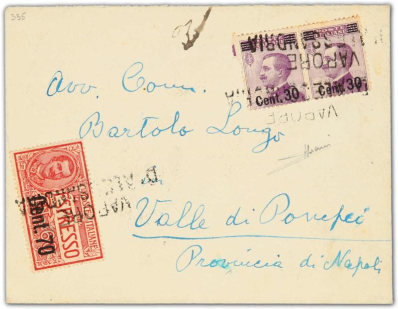 1925, cover sent from Alexandria to Napoli/Italy bearing Italian stamps pair 30 cent and espresso 70 cent tied by rare double straight line "VAPORE D'ALESSANDRIA" cachets, on reverse several transit and arrival cds, signed Sorani (Image)
