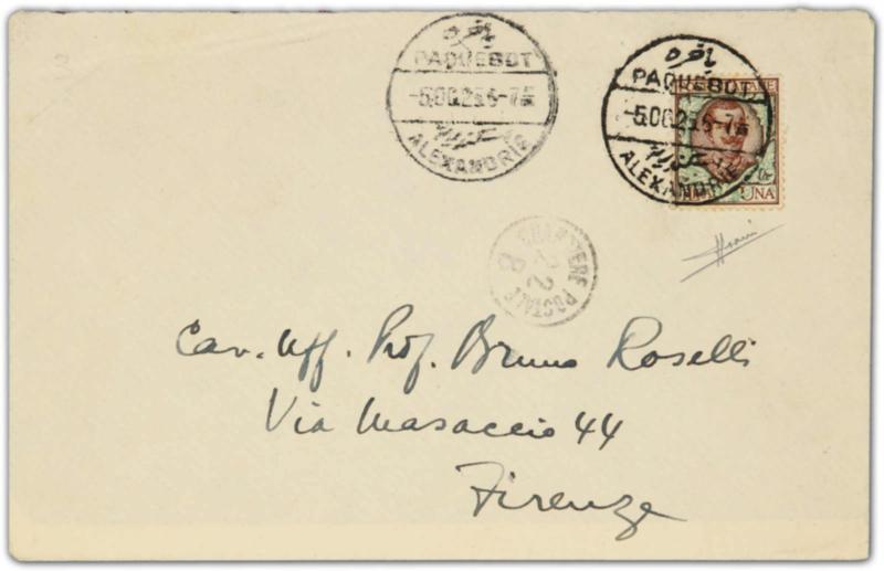 1925, cover sent from Alexandria to Firenze/Italy bearing single franking Victor Emmanuel III issue Una Lira tied by bilingual "PAQUEBOT ALEXANDRIA" postmark, signed Sorani. (Image)