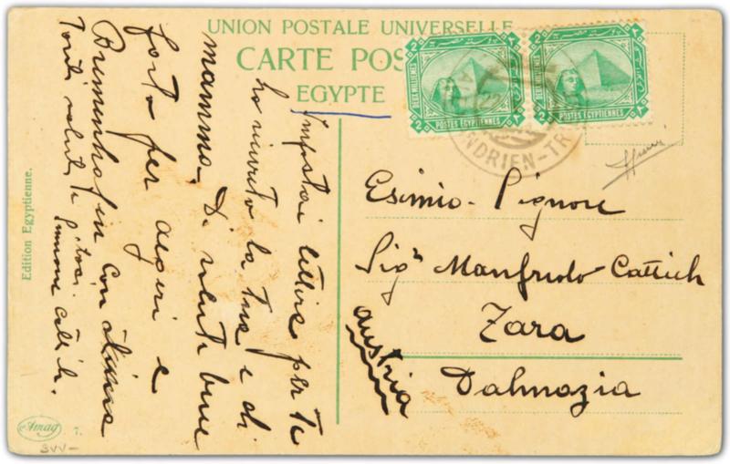 1906, picture postcard of nil bearing pair 2 mil, green tied by "Alexandrien-Triest" ship postmark sent to Zara/Dalmazia, signed Sorani (Image)