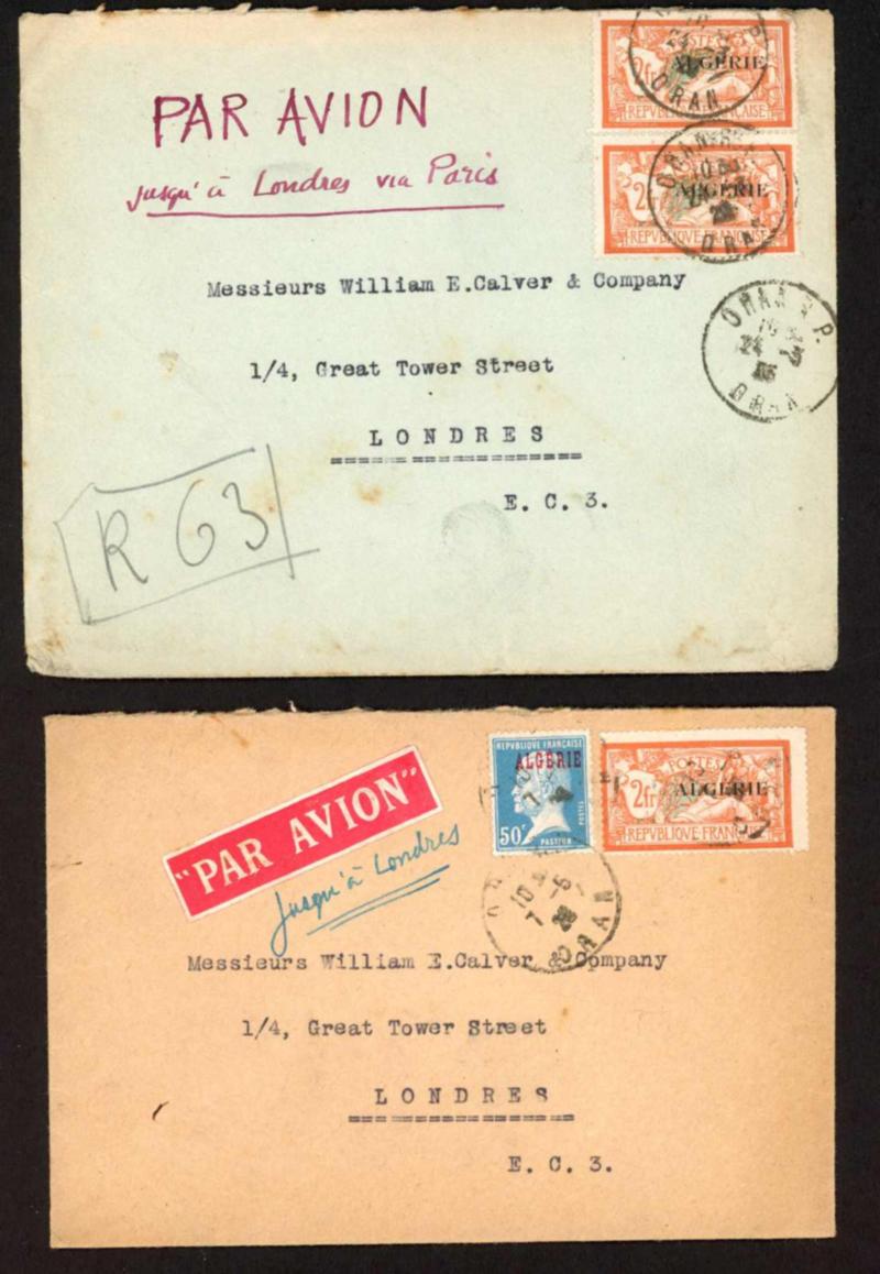 1926, 2 Bedarfsflugbriefe ab Oran nach London, dabei ein Einschreibbrief mit MeF 2 Francs, dieser Transport- und Altersspuren (Image)