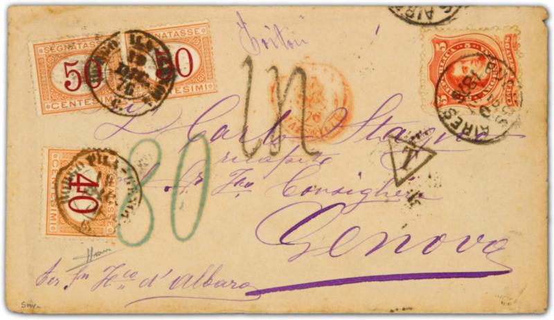 1876, cover sent from Buenos aires to Genova bearing single franking 5 centavos tied by circular "BUENOS AIRES" postmark, in arrival taxed by Italian postage due pair 50 cent. and 40 cent., alongside "80" taxe cachet, on reverse several transit and arrival cds, signed Sorani (Image)
