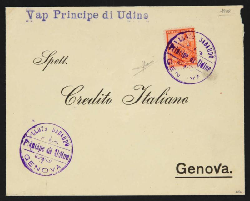 1908, single franking cover bearing 30 cent. tied by very rare and clear blue "LLOYD SABAUDO / GENOVA" ship cachet, also straight line "Vap Principe di Udine" cachet, signed Sorani (Image)