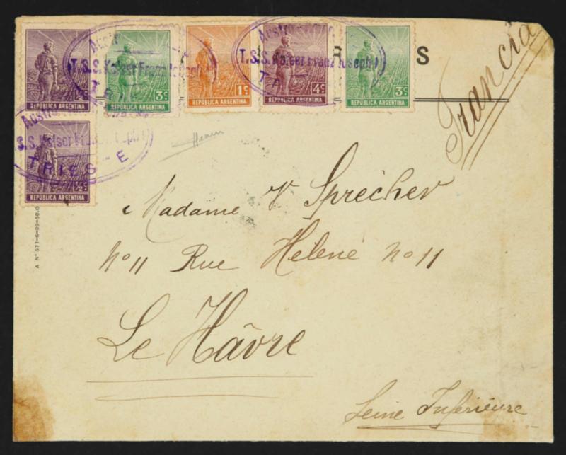 1912, colourful multi-franking cover sent to Le Havre/France tied by triple-oval blue "AUSTRO /T.S.S.Kaiser Franz Joseph / TRIESTE" cachet, signed Sorani (Image)